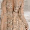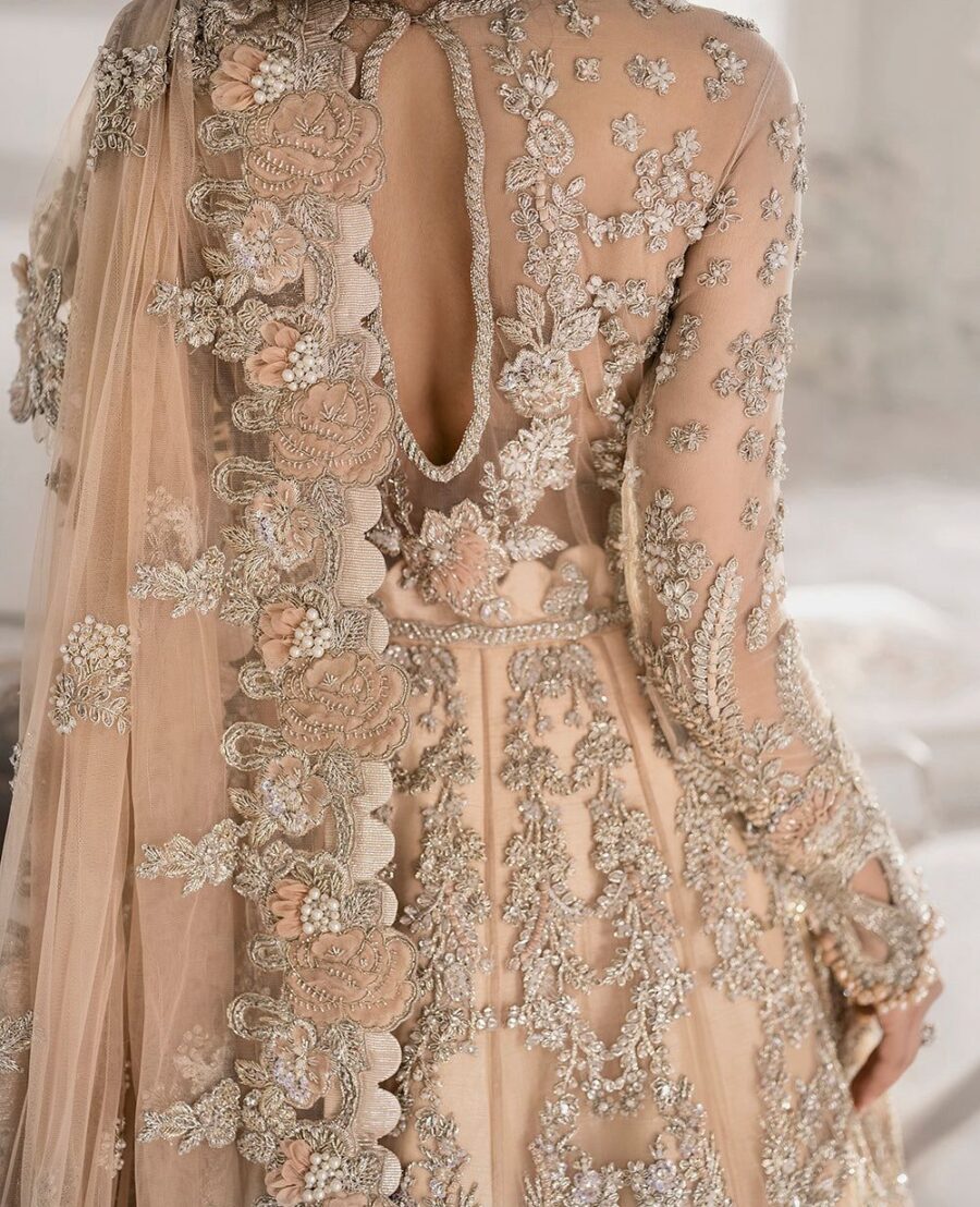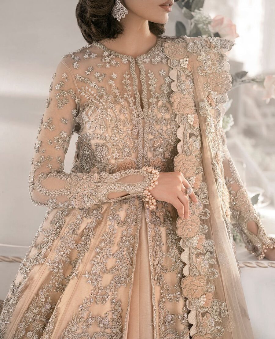 The Waleema wear features delicate pastel shades such as silver-grey, blush pink, mint, or ivory—chosen to complement daytime or evening ceremonies. Adorned with intricate hand embroidery, sequin detailing, pearls, and fine threadwork, the outfit reflects light beautifully, adding a graceful glow to your bridal appearance.