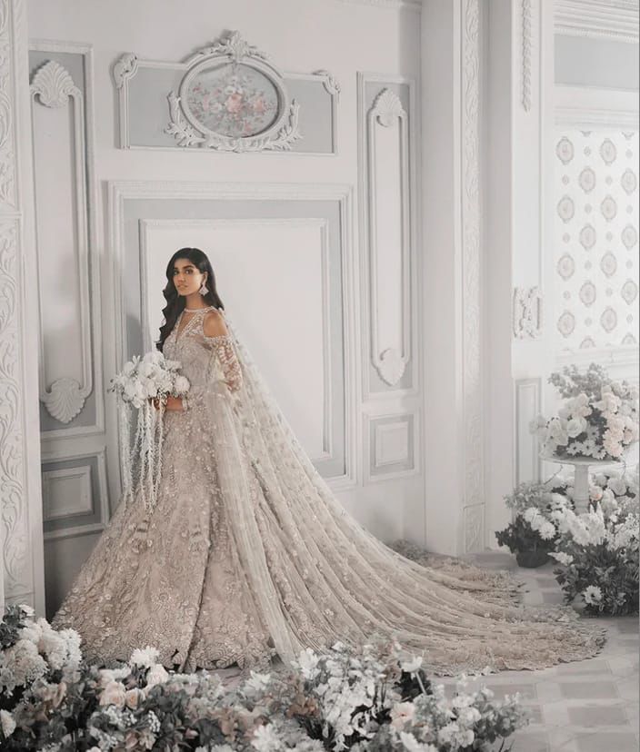 Crafted with meticulous attention to detail, the Wings Maxi features delicate floral embellishments, shimmering sequins, and fine-thread embroidery that dances across luxurious net and organza fabric. The pastel tones – typically in silver, icy peach, or soft champagne – create a dreamy aesthetic perfect for daylight receptions or evening glamour. The flowy, floor-length cut gives the dress a regal fall, making it ideal for grand entrances and picture-perfect poses.